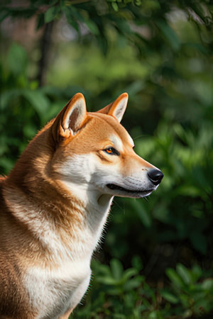 Portrait of beautiful Shiba inu dog standing on the river bank in the forest in summer. Gorgeous red japanese shiba inu dog