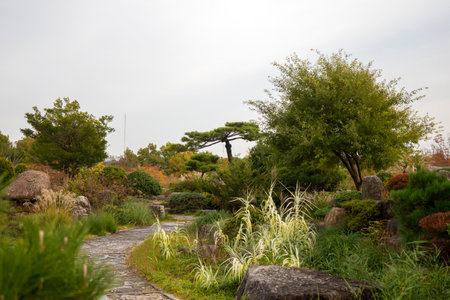 Japanese garden in autumn with a stone path and a pine tree.