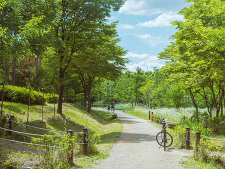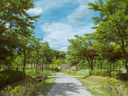 Paved footpathes of Busan citizens park surrounding by beautiful trees on sunny day