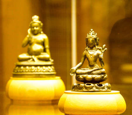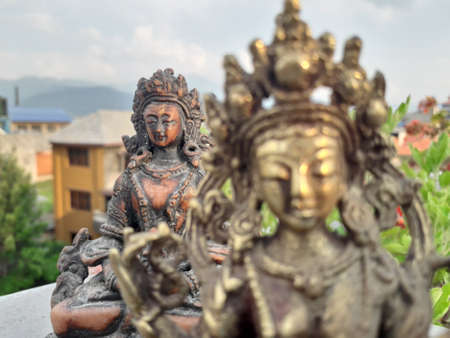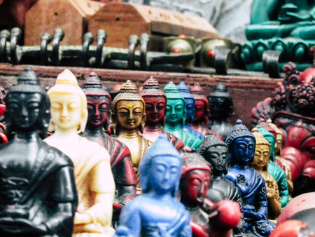Kathmandu Nepal August 31, 2018 Closeup of decorative objects sold in a souvenirs shop at Thamel district in Kathmandu in the afternoon