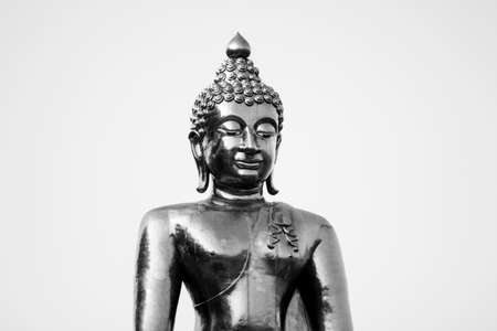 Face of Buddha statue white isolated on black background. Founder of Buddhism. Black and white photo, close up.