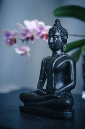 Buddha statue on altar with burning candle. Meditation, buddhism and enlightenment concept
