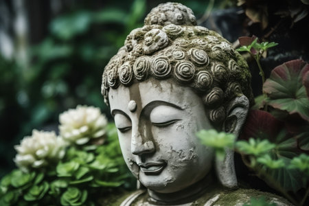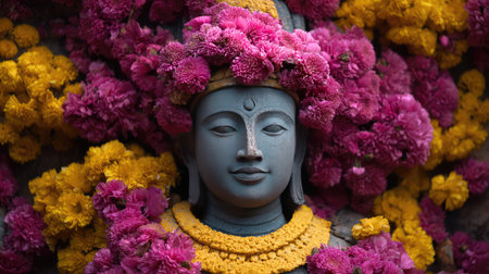 A tranquil Buddha statue adorned with colorful flowers, set against a rich backdrop, symbolizes peace, spirituality, and cultural heritage in a serene outdoor atmosphere.