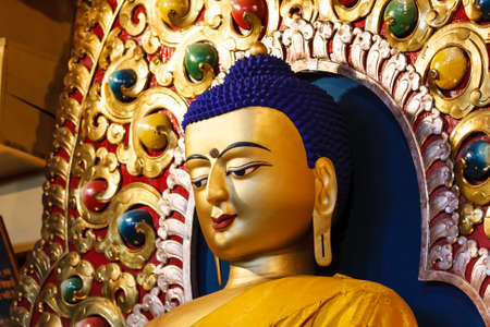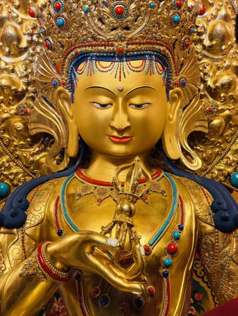 close up colorful sculpture of Maitreya buddha at Thiksey Monastery, Tibetan Buddhist monastery in Ladakh