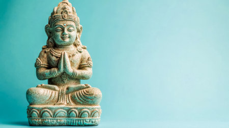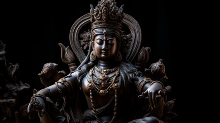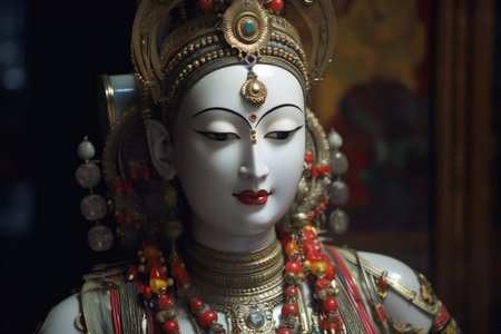 A majestic statue of a goddess stands against a vibrant blue sky. This colorful sculpture showcases intricate details and reflects deep cultural heritage and spirituality.