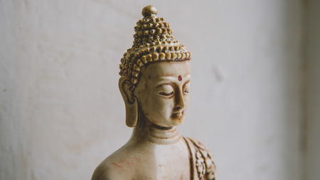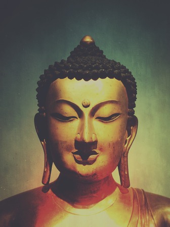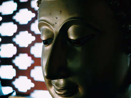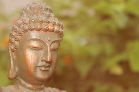 Golden Buddha statue with sunlight used for amulets of Buddhism religion. Buddhism is popular region in China Japan and south east Asia.copy space concept.