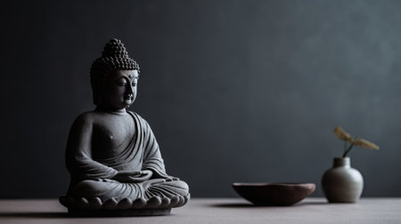 Buddha Purnima and Vesak day concept, Grey Buddha statue with low key light against deep black background close up. Meditation
