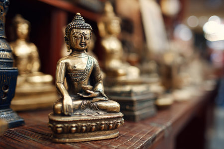 A detailed close-up of a small, antique-looking bronze Buddha figurine in a meditative pose, with other similar figures blurred in the background