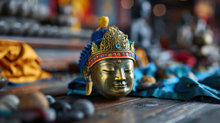 A stunning golden Buddha head adorned with a colorful crown, resting among decorative elements creates a serene ambiance, perfect for conveying tranquility and spirituality.