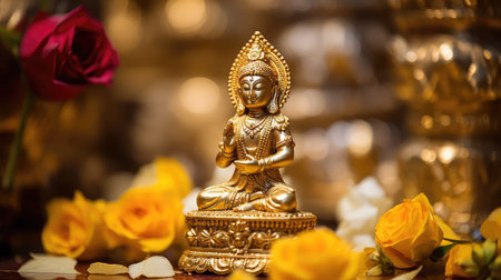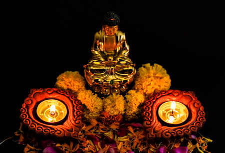two blurred clay lamps on rose petals in front of buddha statue against black background. religious concept
