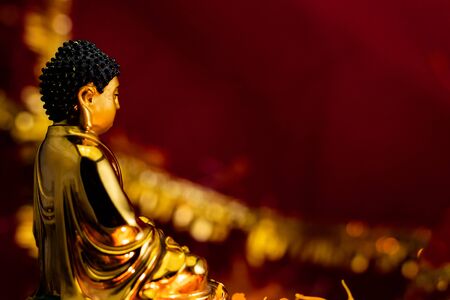 side shot of sitting buddha statue in front of blurry red gloden background with copy space. faith and beleif concept