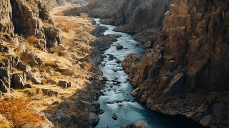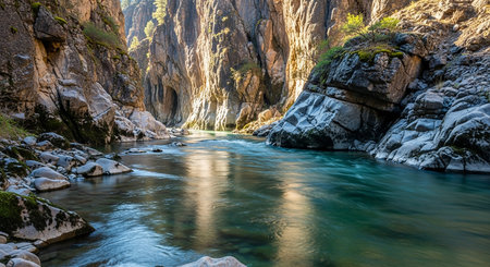 Cliffs showing turquoise river flows through a deep rocky canyon with sunlit cliffs and boulder-strewn banks. resolution