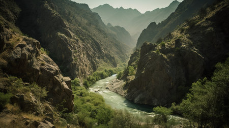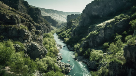 A breathtaking perspective of a tranquil river meandering through towering cliffs, surrounded by lush greenery, revealing nature's beauty and grandeur.