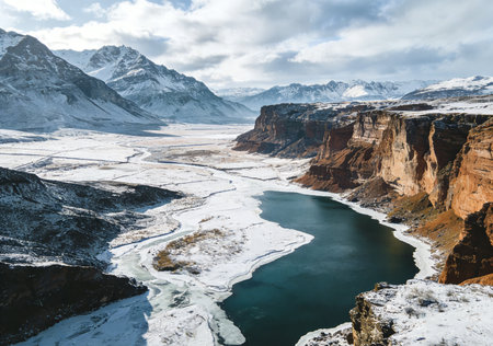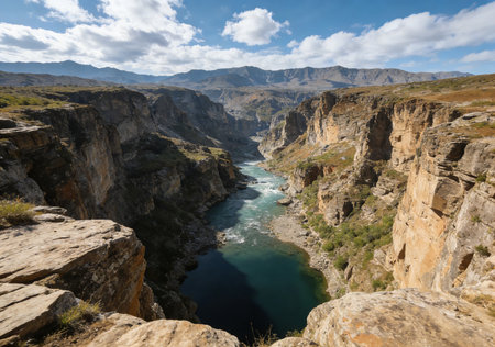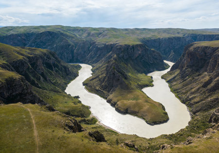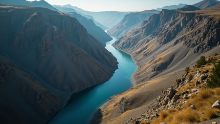 Breathtaking view of a winding river flowing through a dramatic canyon in a mountainous landscape during daylight hours