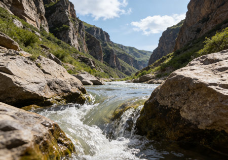 Beautiful view of a mountain river flowing through the rocks in the mountains