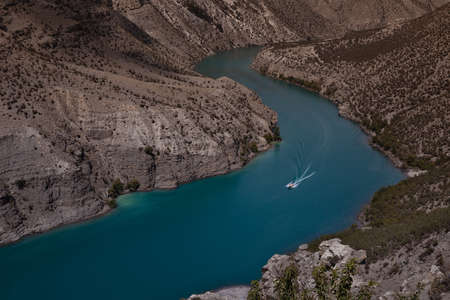 Bright turquoise blue mountain river Sulak with red speed boat float on water, depth steep Sulak canyon slopes. mountain landscape. Adventure, tourism, travel on Caucasian ridge in Dagestan.