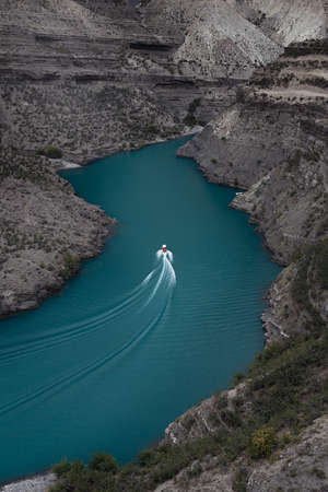 Majestic colorful turquoise blue river, red speed boat float with curved white path, waves on water among high steep mountain slopes, vertical. mountain landscape. Hiking, tourism, travel in the wild.