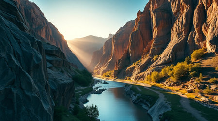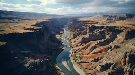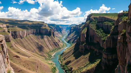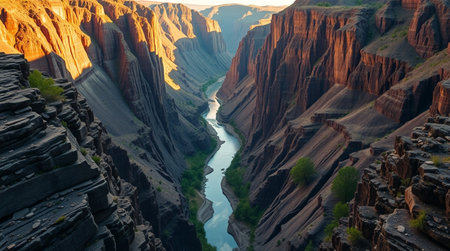 This image captures the breathtaking view of a deep canyon with towering red rock formations. A winding river flows gracefully through the canyon, surrounded by rugged cliffs and sparse vegetation. The scene is illuminated by bright sunlight, casting dramatic shadows and highlighting the natural beauty of the landscape.