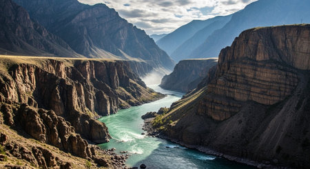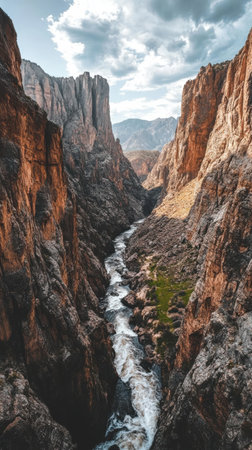 A breathtaking river flows through a narrow gorge, flanked by towering cliffs. The landscape is rugged and awe-inspiring, with a dynamic sky enhancing the natural beauty of the scene.