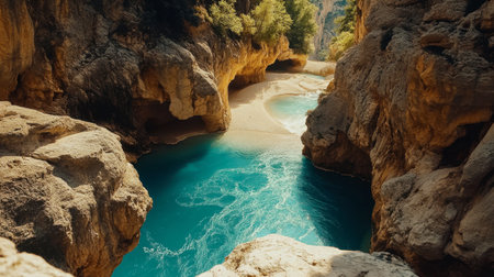 Turquoise water flows swiftly through a narrow rocky canyon surrounded by towering cliffs. Natural light illuminates the rugged textures and vibrant colors of the landscape.