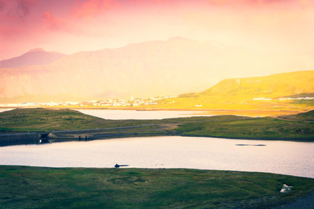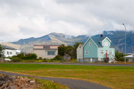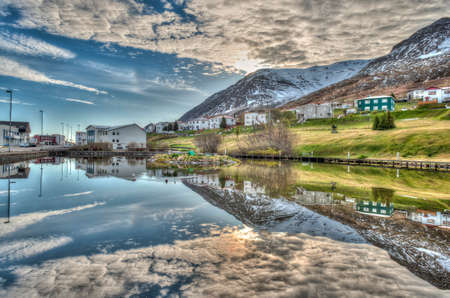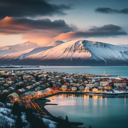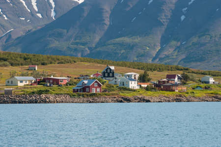 Stunning view of vibrant houses nestled beside tranquil waters, framed by majestic mountains. A perfect representation of Iceland's breathtaking landscapes and charm.