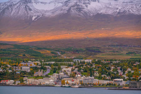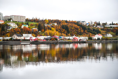 Akureyri in autumn, Northern city of Iceland reflecting on water