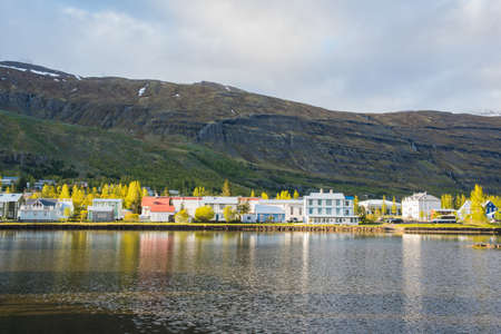 Old buildings near the lake in town of Seydisfjordur in east Iceland