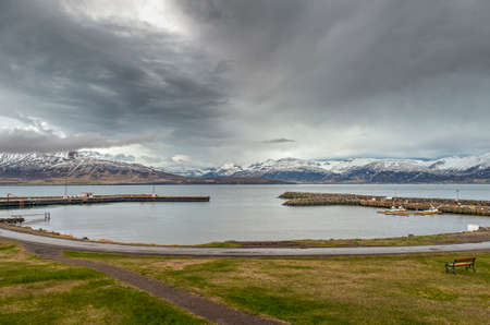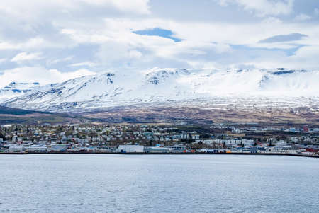 landscape of Akureyri city of northern iceland with ocean and snow mountain cloudy day