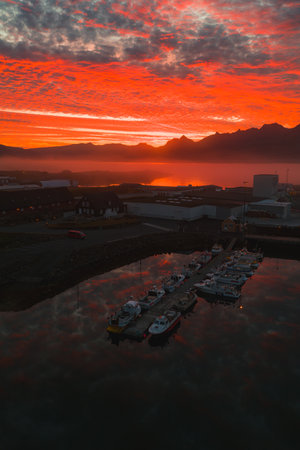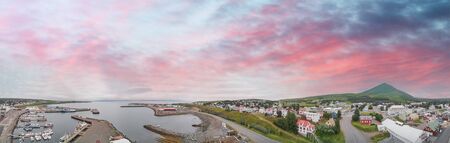 Panoramic sunset aerial view of Husavik port in Northern Iceland, the city is famous for whales tours.