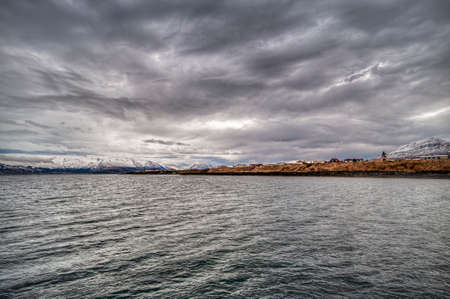 Akureyri, Iceland, the town seen from the sea in a cloudy day after the sunset