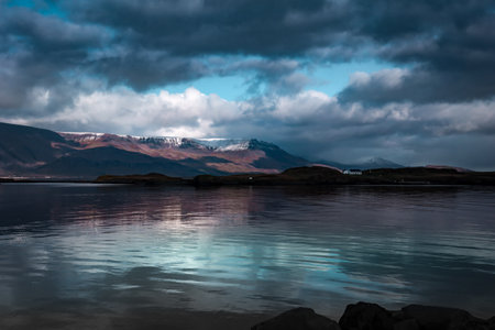 Landscape with Mount Esja and Atlantic ocean in Reykjavik, Iceland.