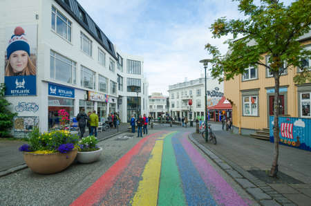 Reykjavik, Iceland, August 27, 2018 - Tourists walk along the main shopping street with its brightly painted rainbow colors in one of the gay-friendliest cities on the planet.