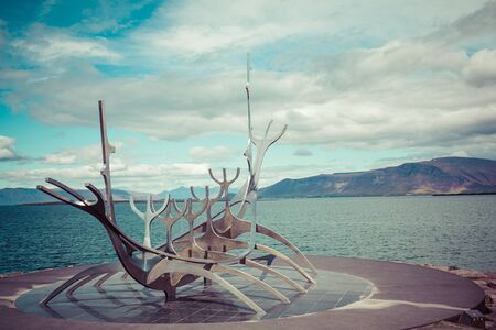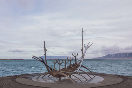 A large stainless-steel Viking boat sculpture Sun Voyager in the harbor at Reykjavik, Iceland