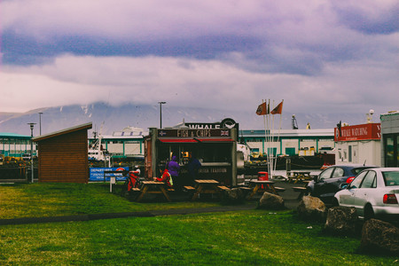 photograph of a fish and chip food truck stationed along the old harbour in Reykjavik. Iceland is known for their high quality fresh fish.