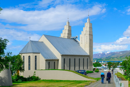 AKUREYRI, ICELAND - JUNE 17, 2016: View of the Akureyrarkirkja church, with Locals and visitors, in Akureyri, Iceland