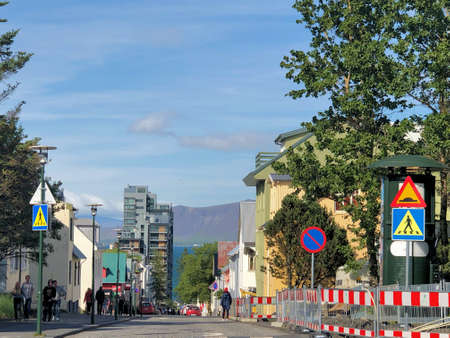 People are walking over a street in the city of Reykjavik in Iceland 30.6.2019
