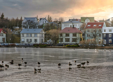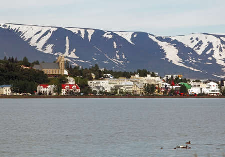 A panoramic view of colorful central Reykjavik as seen from across Tjörnin Lake.