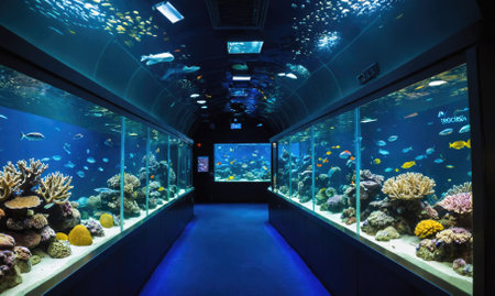 A walkway surrounded by large aquariums filled with colorful fish and coral reefs