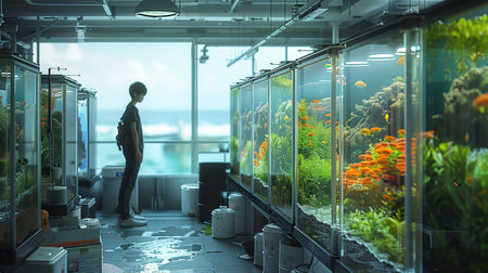 Young man looking at fish and algae in a tank at the aquarium