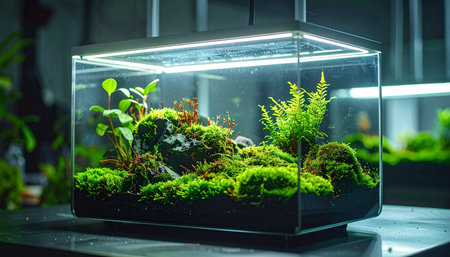 A vibrant indoor terrarium showcases a variety of green plants, creating a miniature ecosystem within a sleek, curved glass enclosure.