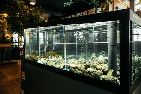 an aquarium with oysters and lobsters in the restaurant,