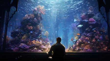 A visitor stands captivated by a stunning display of colorful corals and diverse fish at an engaging aquarium exhibit, celebrating ocean beauty.