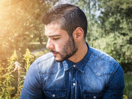 Handsome young man at countryside, in front of field or grassland, wearing shirt, looking away to a side