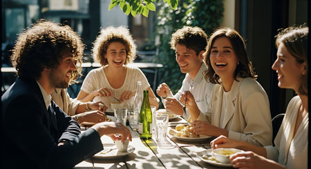 A group of friends enjoying a meal outdoors, laughing and sharing food, with plates of colorful dishes and drinks on the table