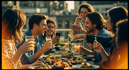 A group of friends gathered around a table outdoors, sharing food and drinks during sunset. They are laughing and enjoying each other's company.