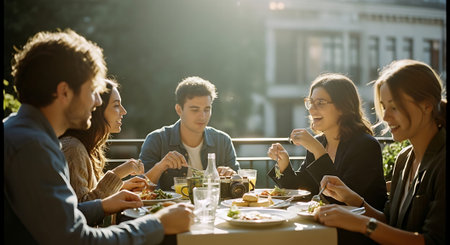 Enjoying a vibrant meal with friends at a rustic table on a sunny day during lunch time