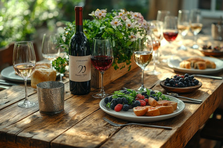 Outdoor wine tasting, garden setting, friends enjoying lunch