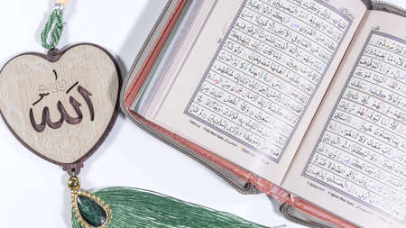 opened book of Quran or Kuran (the holy book of all Muslim) on the table with rosary beed, arabic texts mean Allah .