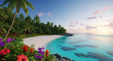Tropical beach with palm trees and flowers at sunset, Seychelles