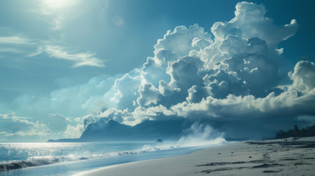 A beach scene with pyrocumulus clouds forming above signaling the nearby presence of a volcanic eruption